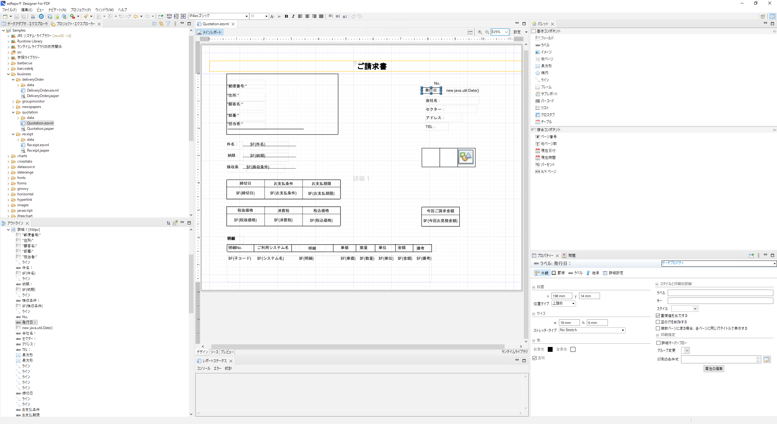 ezRepoは誰でも操作でき、ノーコードによるカスタマイズも可能、高効率や低コストを実現した帳票開発システムです。レイアウトや書式といった外観デザインの設定からデータ接続、PDFへの出力設定まで、業務システムにおける文字、グラフ、画像、罫線、テーブル、バーコードなどを含む帳票設計に必要なあらゆる機能を備えています。