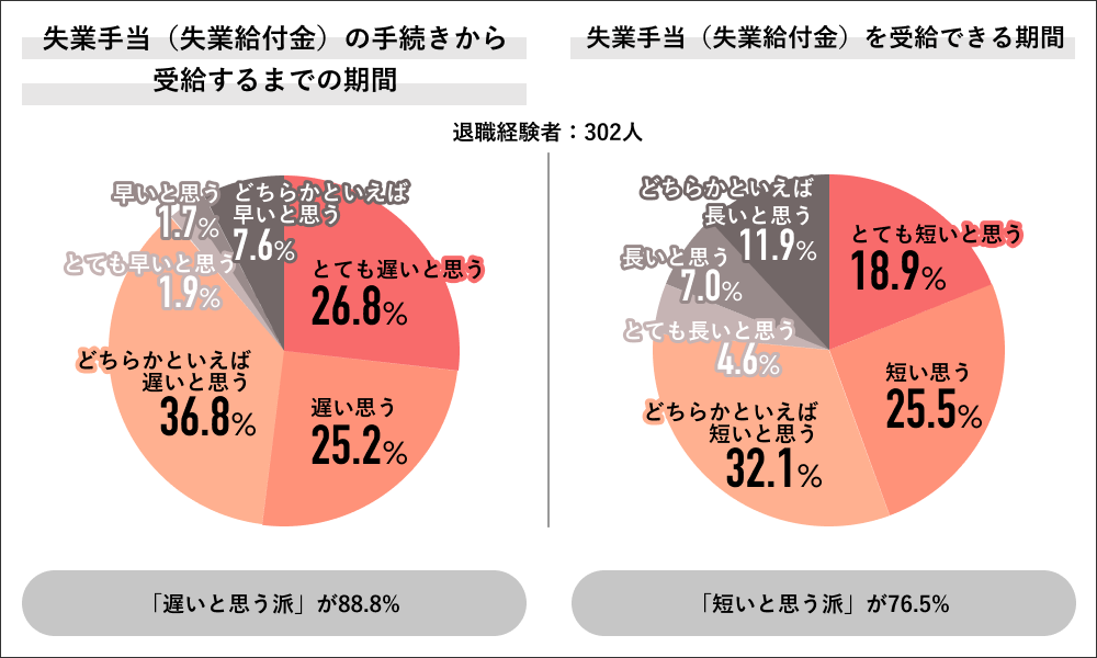 退職経験のある302人に失業給金の手続きから受給できるまでの期間への印象を聞くと、「とても遅い」26.8%、「遅い」25.2%、「どちらかといえば遅い」36.8%を合算した88.8%が”遅い派”の回答をしました。また失業給付金を受給できる期間への印象を聞くと、「とても短い」18.9%、「短い」25.5%、「どちらかといえば短い」32.1%を合算した76.5%が”短い派”の回答をしました。