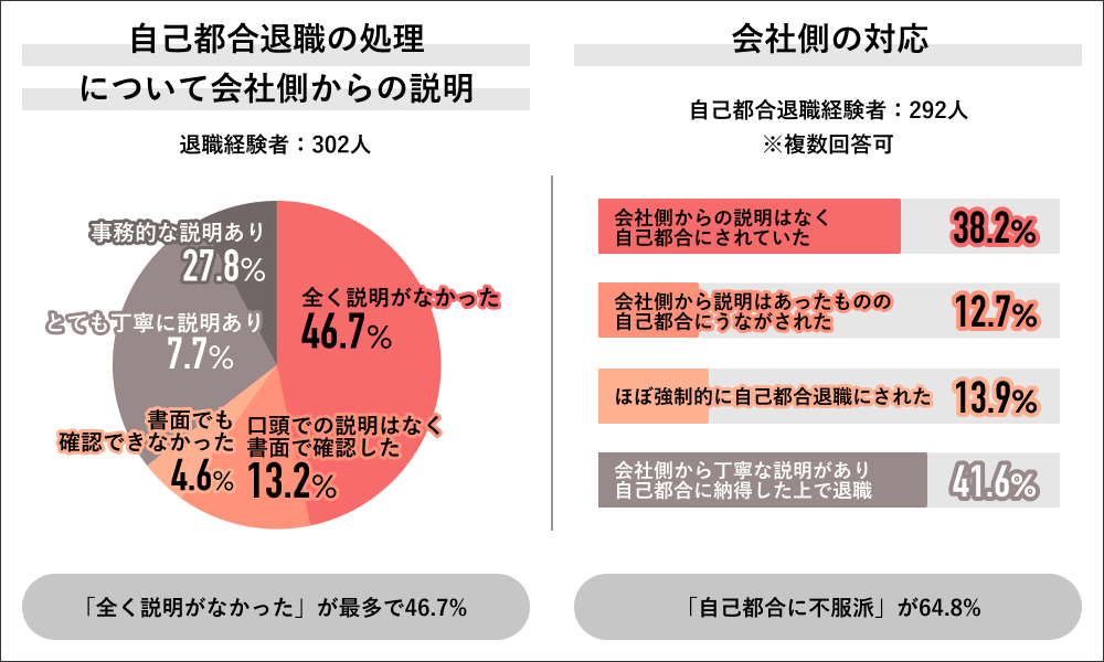 退職経験のある302人に自己都合退職時の会社側の対応について聞くと、「全く説明がなかった」が46.7%で最多回答になり、他に「口頭での説明はなく書面で確認した」が13.2%、「口頭での説明はなく書面でも確認できなかった」が4.6%で、これらを合算すると、自己都合退職時に64.5%が “口頭での説明がない”ことがわかります。また自己都合退職経験のある292人に会社側の具体的な対応について聞くと、「会社側から説明なく自己都合退職にされた」が38.2%で最多になり、次いで「会社側から説明はあったものの自己都合退職に促された」が12.7%、「ほぼ強制的に自己都合退職にされた」が13.9%でした。このことから64.8%が自己都合退職に不服を感じていることがわかりました。
