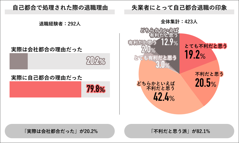 また回答者全体の423人に失業者にとっての自己都合退職に対する印象を聞くと、「とても不利だと思う」19.2%、「不利だと思う」20.5%、「どちらかといえば不利だと思う」42.4%を合算した82.1%が”不利だと思う派”の回答をしました。