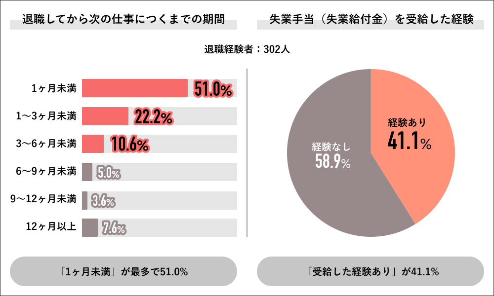 退職経験のある302人に退職してから次の仕事に就くまでの期間を聞くと、「1ヶ月未満」が51.0%で最多になり、次いで「1〜3ヶ月未満」が22.2%、「3〜6ヶ月未満」が10.4%で上位3つの回答結果でした。「6ヶ月以上」の回答は16.2%でした。また失業給付金の受給経験の有無を聞くと、「経験あり」が41.1%で、「経験なし」が58.9%でした。