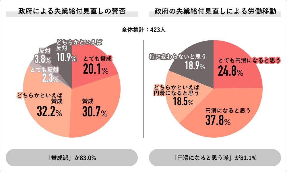 回答者全体の423人に、政府による失業給付の見直しへの賛否では、「とても賛成」20.1%、「賛成」30.7%、「どちらかといえば賛成」32.2%を合算した83.0%が”賛成派”の回答をしました。”反対派”の回答は全体の17.0%でした。また失業給付の見直しで転職などの労働移動への影響について聞くと、「とても円滑になると思う」24.8%、「円滑になると思う」37.8%、「どちらかといえば円滑になると思う」18.5%を合算した81.1%が”円滑になる派”の回答をしました。「特に変わらないと思う」は全体の18.9%でした。