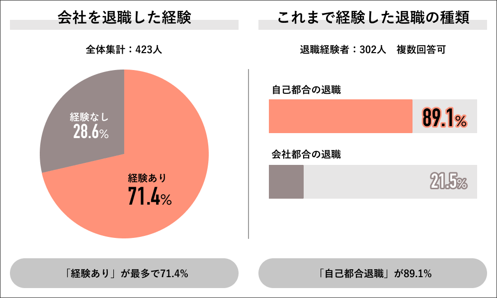 これまでの退職経験の有無では、「経験あり」が71.4%で、「退職経験なし」が28.6%でした。退職経験のある302人に退職の種類を聞くと、89.1%が「自己都合退職」の経験があると回答し、「会社都合退職」は21.5%でした。