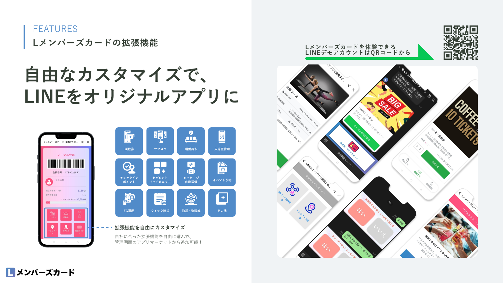 Lメンバーズカードは、LINE上で完結し、多くの業種に対応して自由に拡張機能をカスタマイズできるデジタル会員証サービス