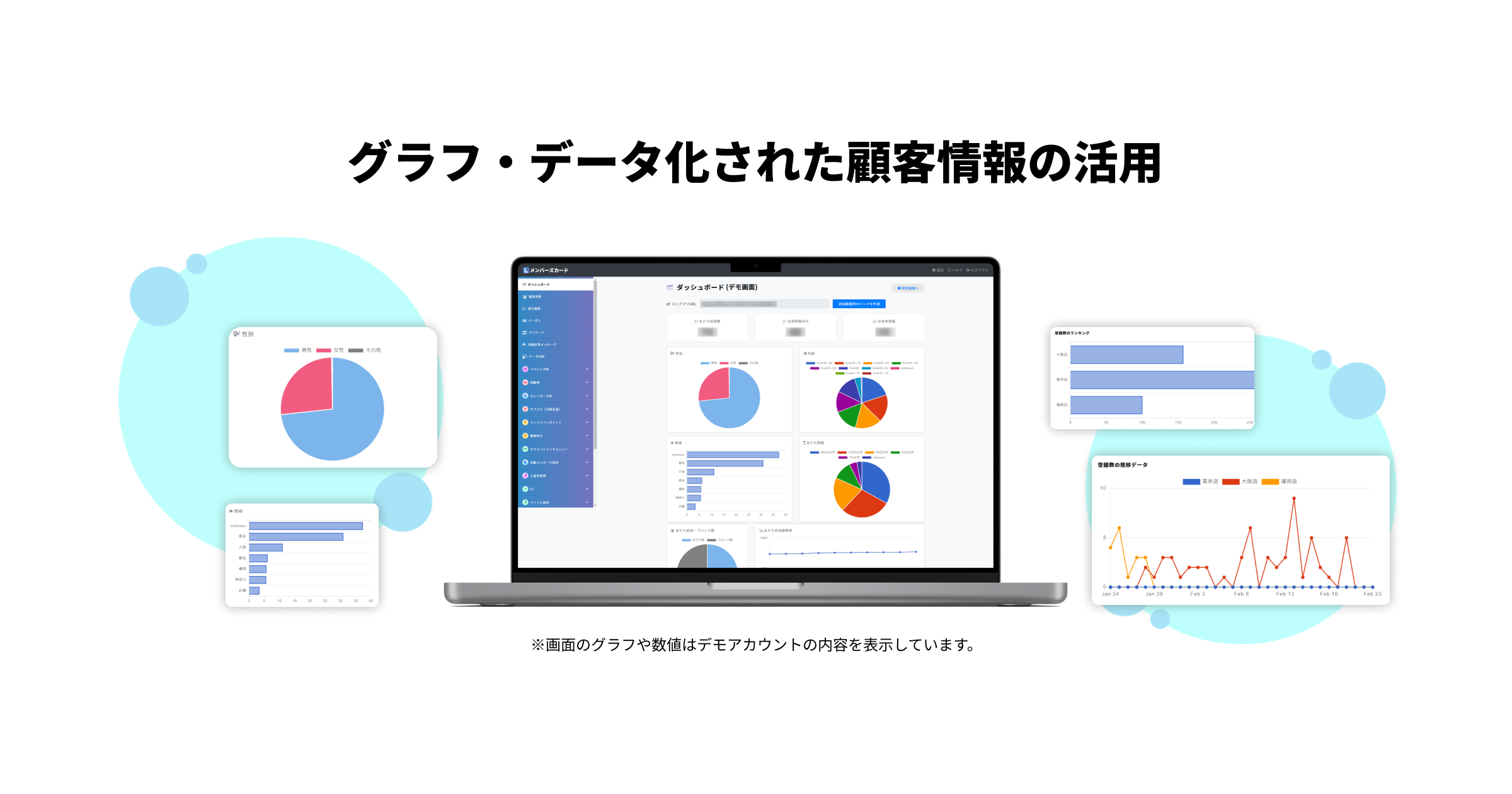 Lメンバーズカードの管理画面では、様々な顧客情報をデータベース化しており、円グラフや折れ線グラフなど、可視化したデータを確認することができます。福岡スケートボード協会においても、施設利用者の属性をすぐに把握できるため、資料作成や顧客分析の業務効率化が実現しました。