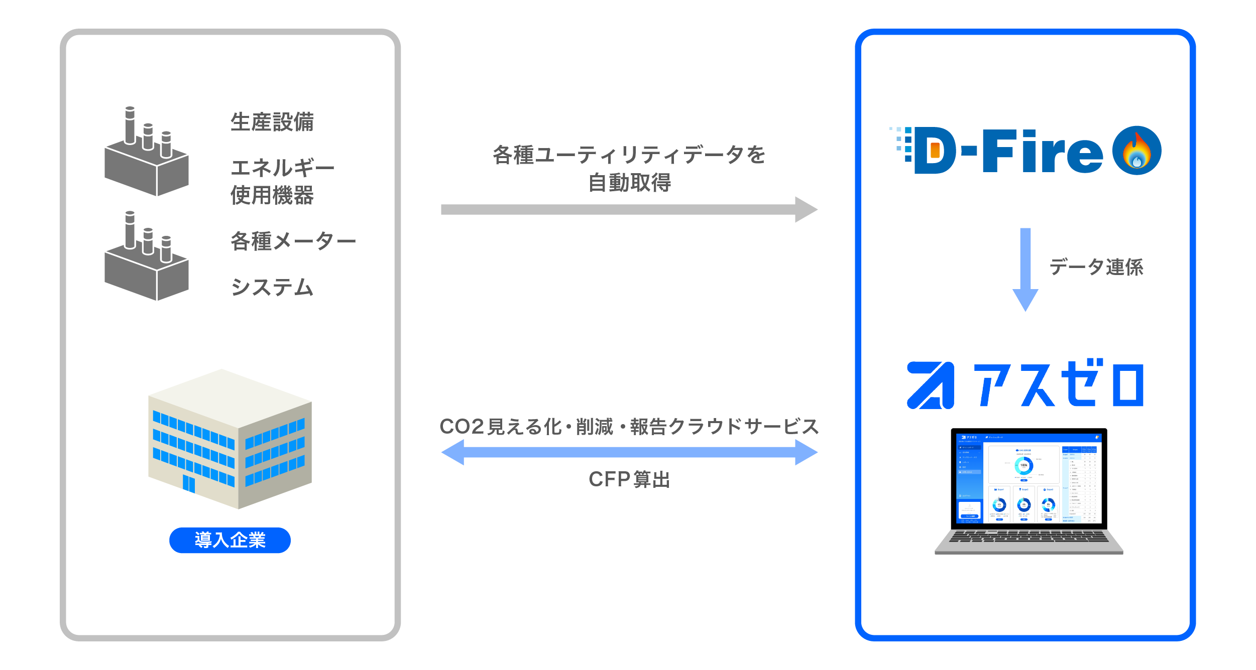 「D-Fire」では工場設備における機器、設備、製造ラインごとのScope1-2の活動量を一次データとして取得できます。各製造ラインや設備の稼働実態を踏まえたCO2排出量を一次データとして「アスゼロ」に自動で連係させられるため、より実態に即したCFPの算出が可能となります。企業は、本データ連係の活用により、CO2排出量の見える化業務工数を削減しながら、精緻なCFPの算出が可能となります。