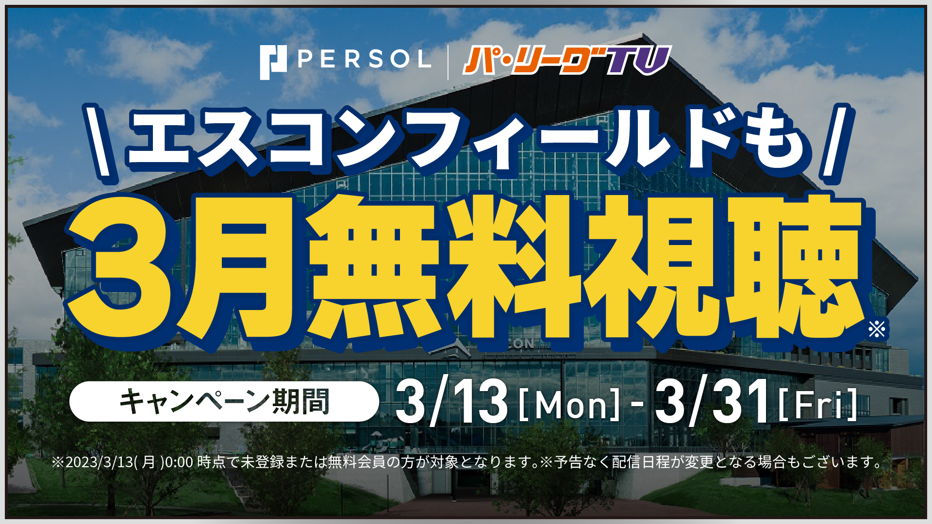「パーソル パ・リーグTV」は、パ・リーグ主催の公式戦や交流戦*1、パーソル クライマックスシリーズ パやファーム公式戦*2などの試合をLIVE 配信し、スマートフォンやPCなどでご視聴いただけるリーグ公式動画配信サービスです。今回のキャンペーンでは、北海道日本ハムの本拠地「ES CON FIELD HOKKAIDO(エスコンフィールド)」のこけら落としとなる3月14日(火)のオープン戦から開幕戦まで無料でご視聴いただけます。