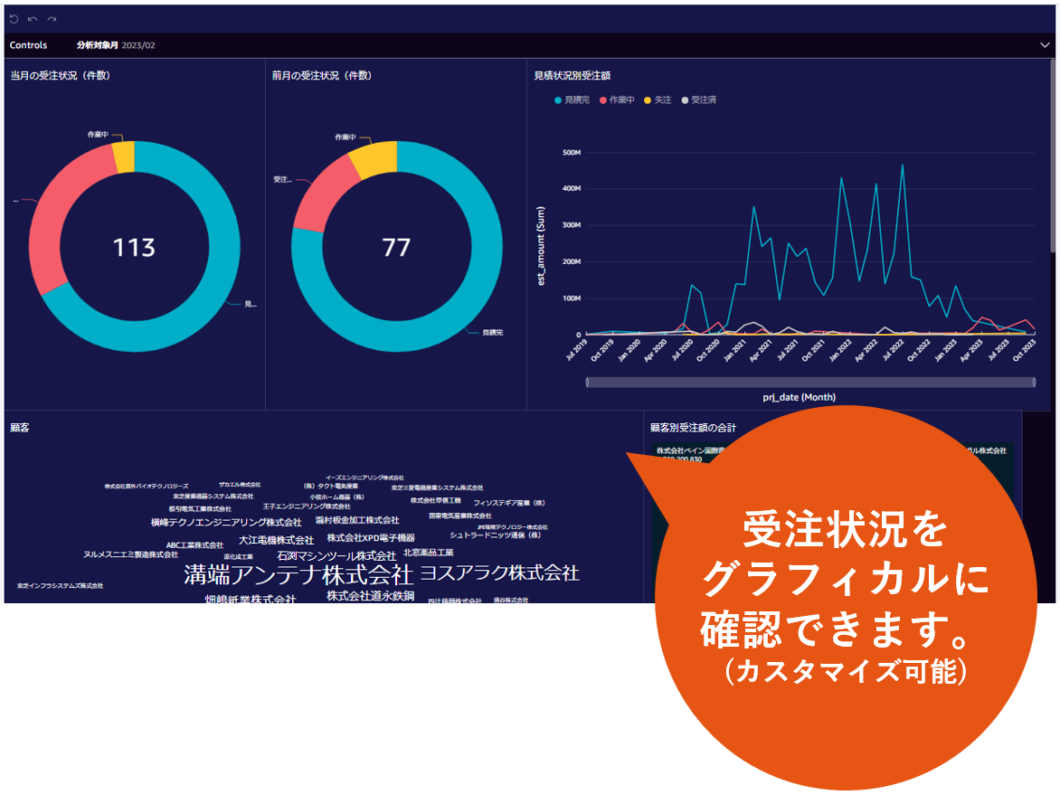 また、ESTmanで作成した見積書のデータから、受注/失注の状況をグラフで一覧表示し、経営状況を分析することができます。