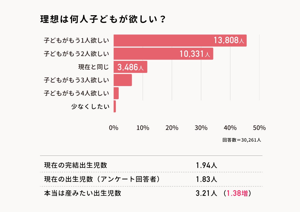 「もしお金の心配や子育てに関する不安がない場合、子どもは全部で何人欲しいと思いますか?」という設問に対して、99%のママ・パパたちが「今よりも1人~4人多く産みたい」と回答しました。今回の調査では、お金や子育ての悩みを乗り越えることで「今よりも夫婦1組あたり1.38人子どもが増える」可能性があることがわかりました。