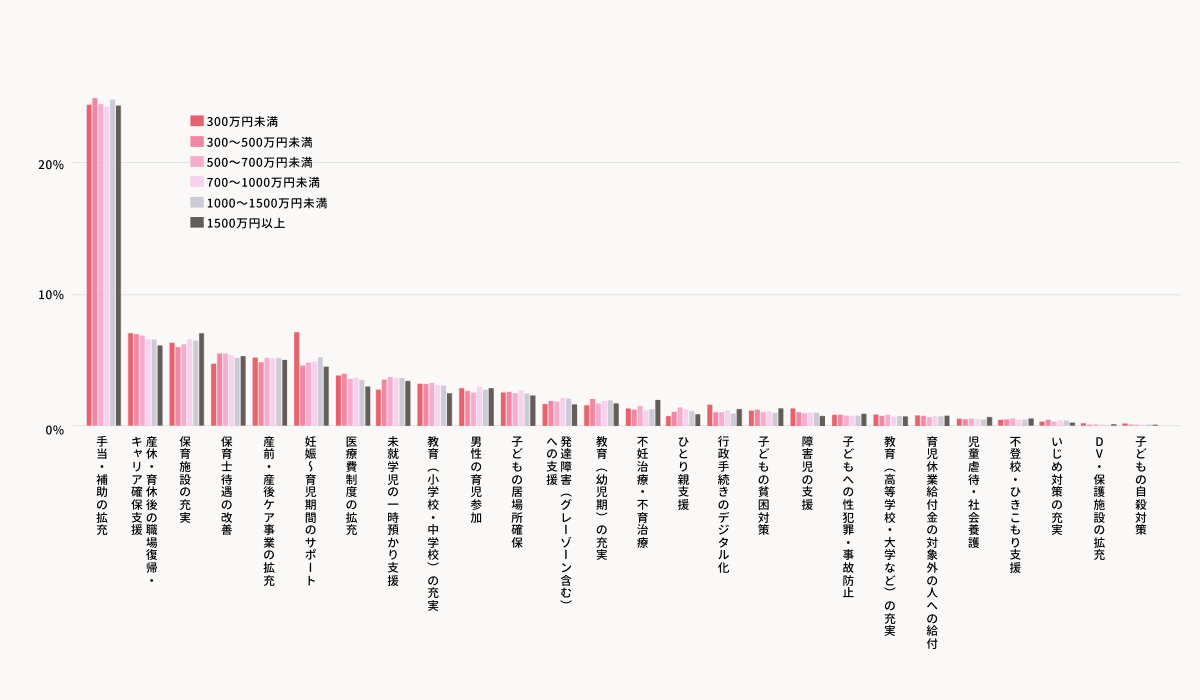 ママやパパたちが選ぶ「今、必要だと思う政策」を26つのカテゴリー(その他含む)に分類したところ、世帯の総所得が100万〜2,000万円まで分布しているのにも関わらず、「子育てにおいて必要な支援」はほぼ同じ割合となり、子育て世帯の悩みは所得ではなく、子どもの成長過程に応じて生まれるものと見ることができました。