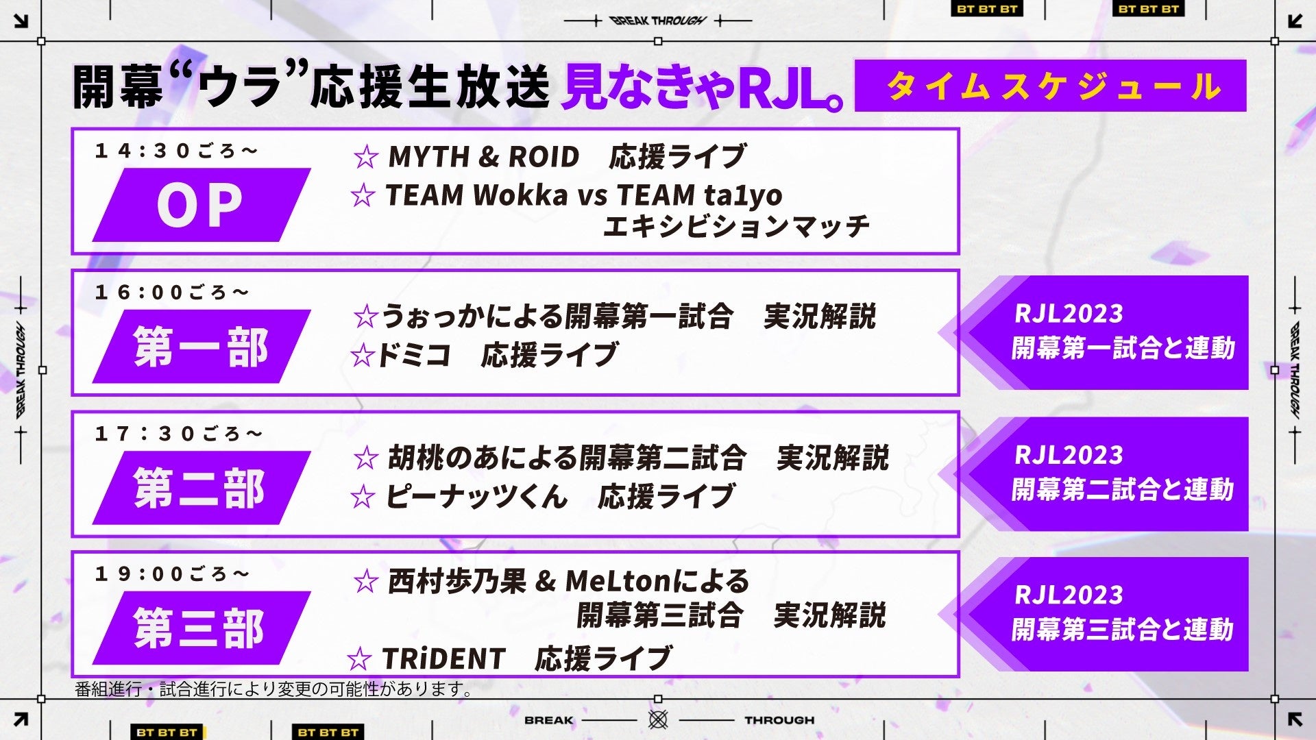 番組オープニングでは、人気ユニットMYTH & ROIDのライブ演奏と、TEAM Wokka vs TEAM ta1yoのエキシビションマッチを開催。以降、第一部~第三部は、RJL2023の本戦時間と連動し、ライブアクトと本戦実況解説が行われます。人気アーティストの出演する応援ライブはもちろん、RJL2023の本戦と同時に実況解説を視聴することで、より楽しめる企画となっています。
