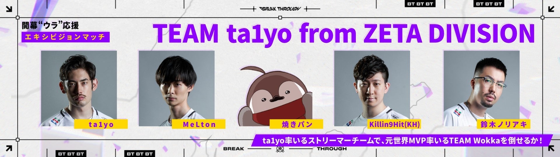 そんなTEAM Wokkaに対するは、人気ストリーマーta1yoをはじめとし、ZETA DIVISIONから、MeLton、焼きパン、Killin9Hit(KH)、そして鈴木ノリアキの5名。前回の「Wokka再臨。~そして、最強へ~」では、味方だったMeLtonが今度はTEAM ta1yoとして参加。うぉっか率いるチームとどうバトルを繰り広げるのか。注目のエキシビションマッチをお楽しみください。