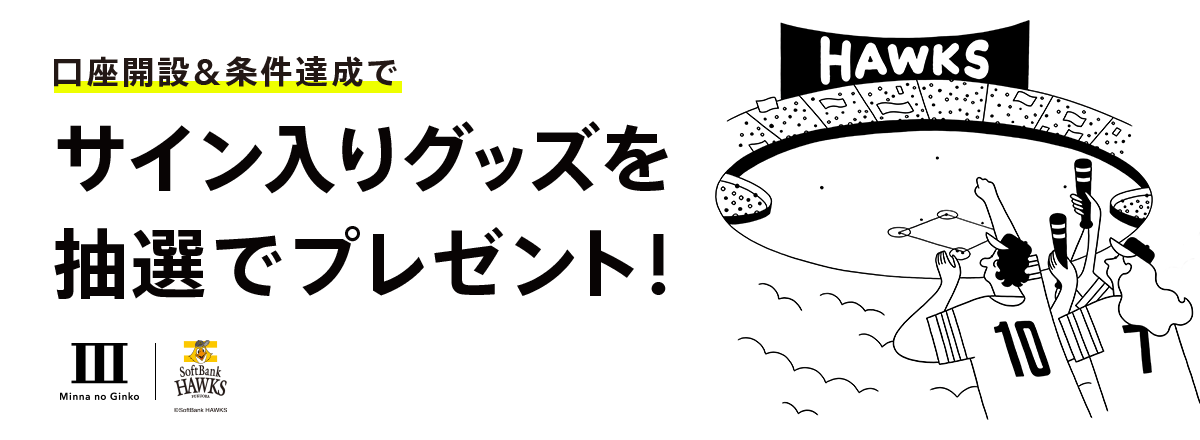 | 対象者 | 下記a~dを全て満たした方が対象となります a.開催期間中に、新規にみんなの銀行の預金口座を開設した方 b.開催期間中に、みんなの銀行の普通預金口座に10万円以上入金した方 c.2023年3月31日23時59分時点の「ホークス応援」Box残高が10万円以上ある方 d.特設サイト内の応募フォームからご応募いただいた方 ※「ホークス応援」Boxについての詳細は、特設サイトよりご確認ください |