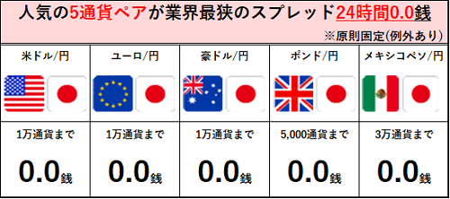 ※主要経済指標発表時等の急変時、国内外の休日や平日早朝など著しい流動性低下時はやむをえずスプレッドを拡大する場合がございます。 メンテナンス時間(火曜日~金曜日 各日5:55~6:10、土曜日5:50~月曜日7:00)は適用時間に含まれません。