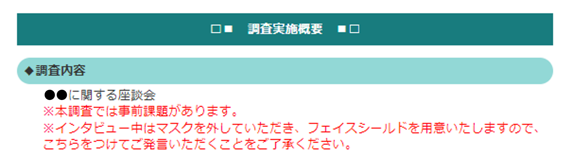 調査依頼元の希望として「マスク着脱いずれかが必須」の調査時には、冒頭の調査概要提示画面に赤字でその旨を記載いたします。
