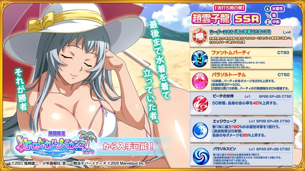 本日開始の「トロピカルバカンスガチャVol.1」では、新たに「【波打ち際の華】趙雲子龍」(CV:浅川悠)」が登場。同ガチャでは、「【波打ち際の華】趙雲子龍」の排出率が他の同レアリティの闘士よりも高くなっております!