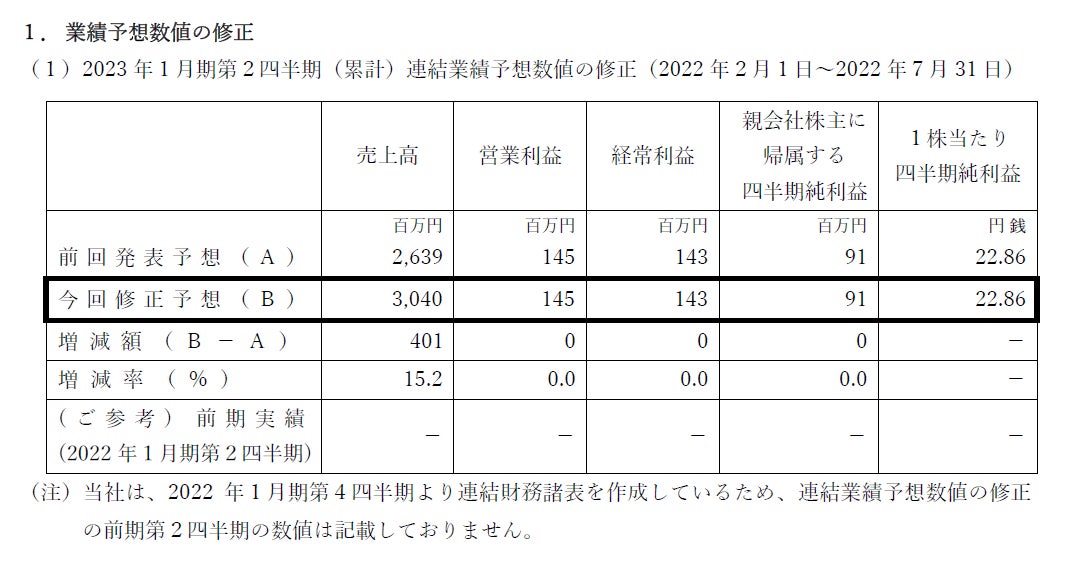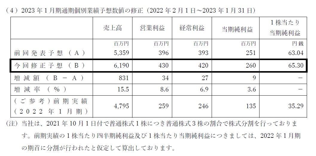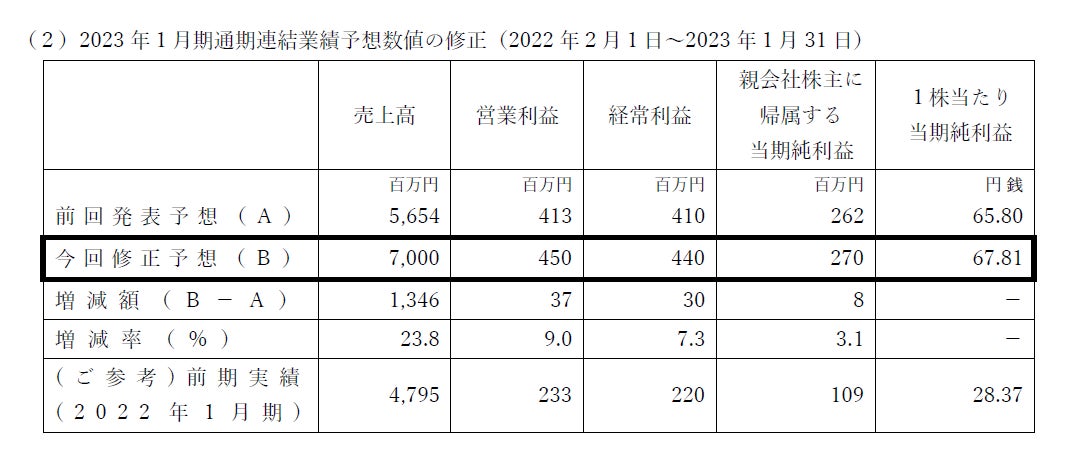 その結果、営業利益等が2022年3月16日に公表した2023年1月期第2四半期累計期間及び通期の連結・個別の業績予想を上回る見込みとなり、このたび修正いたしました。