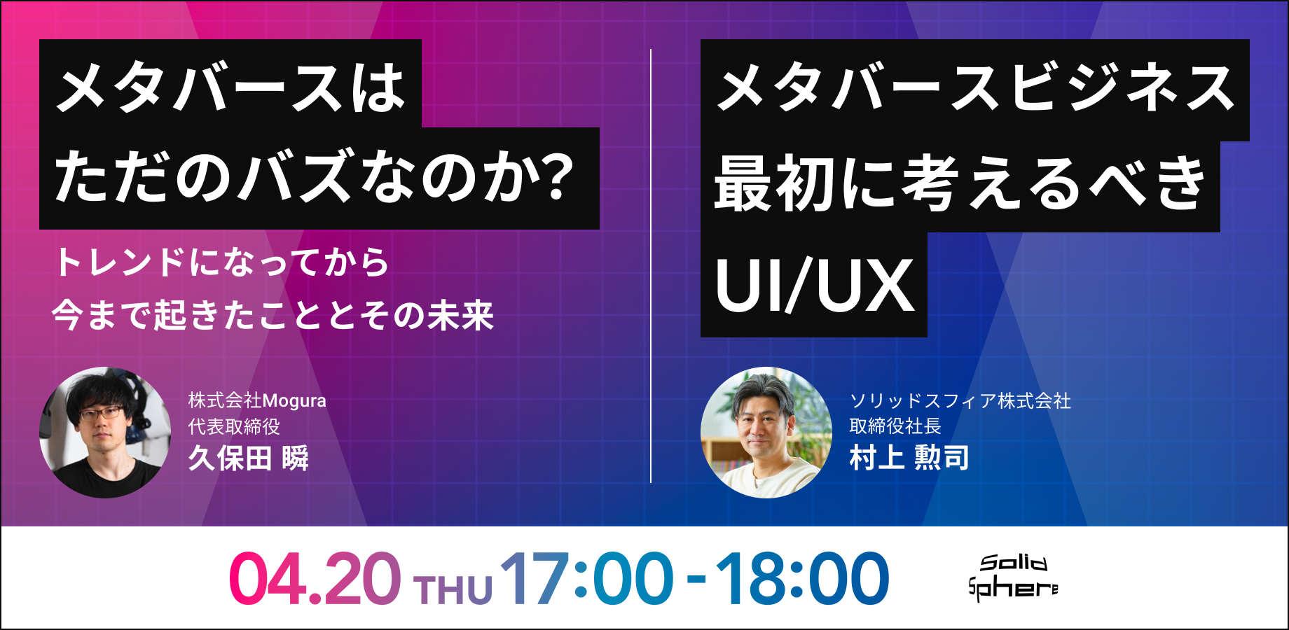 本セミナーでは、3つのパートでメタバースに関するコンテンツを提供いたします。まず1つ目に、メタバースとは何か、今世界の各社がどのようなプラットフォーム展開をしておりどんな特徴があるのか、独自調査したものをご紹介します。2つ目は、ゲストスピーカーに株式会社Mogura 代表取締役 久保田氏をお迎えし、同社の仕掛ける「メタバースはただのバズなのか?〜トレンドになってから今まで起きたこととその未来〜」をテーマにお話頂きます。3つ目のパートでは、当社が考えるメタバースビジネスで最初に考えるべきUI/UXについてお話させていただきます。