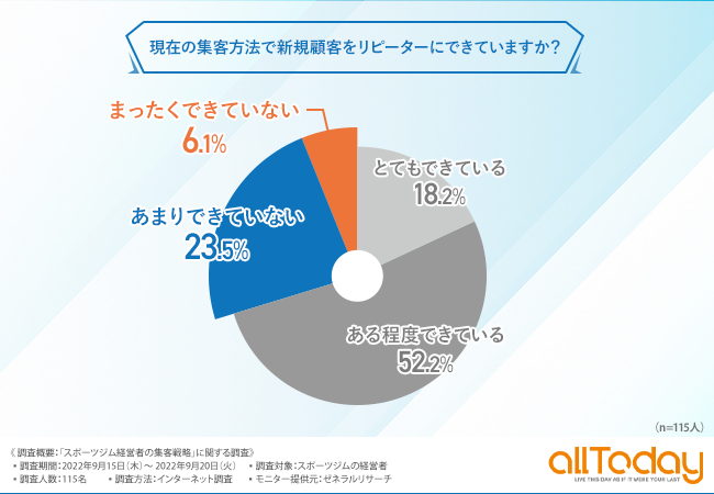 「現在の集客方法で新規顧客をリピーターにできていますか?」と質問したところ、約3割の方が『まったくできていない(6.1%)』『あまりできていない(23.5%)』と回答しました。