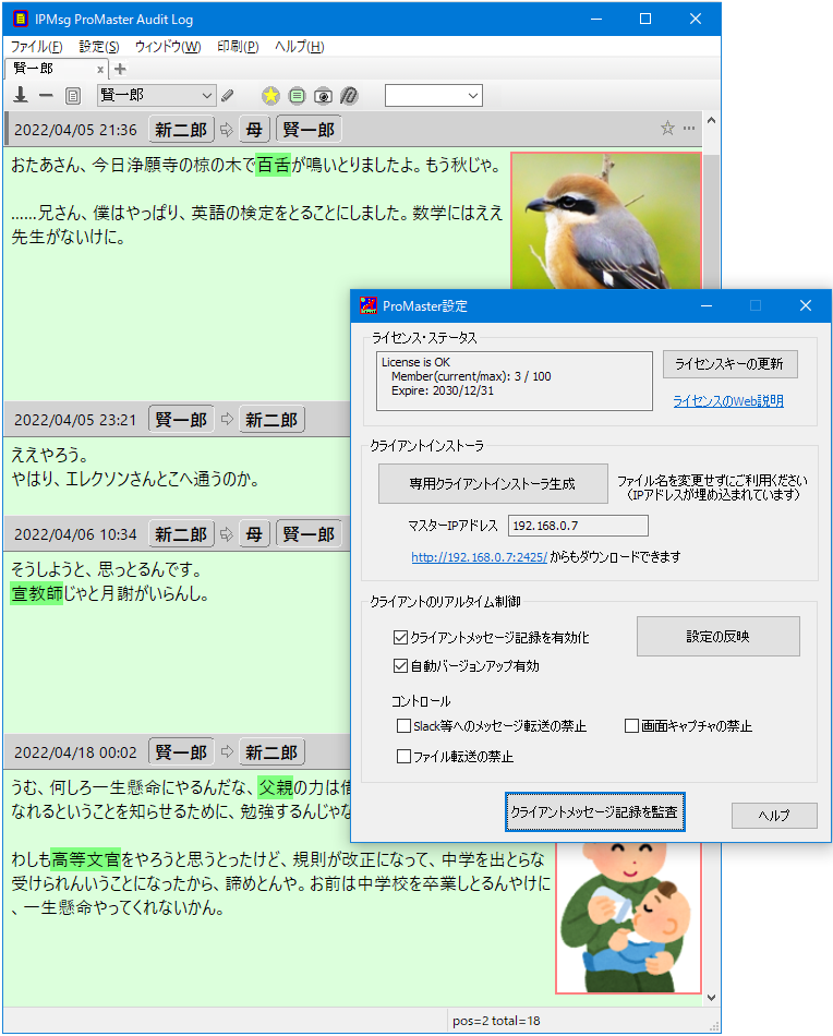 「IP Messenger Pro」は、企業様よりご要望の多かった「ログ監査機能」や「メッセージ外部転送の許可/禁止」などの各種コンプライアンス機能を搭載した、年間170万ダウンロードを誇る「IP Messenger」の商用版です。また設定不要な専用インストーラ生成機能など、管理コスト低減機能も搭載しております。