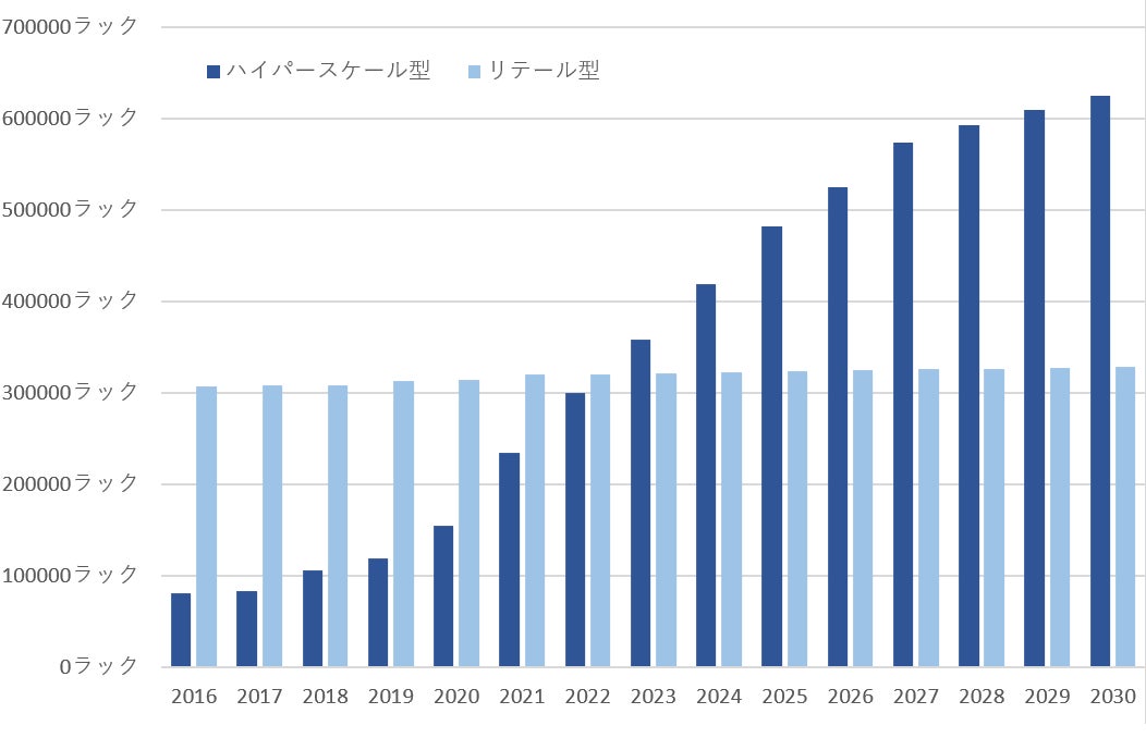【図表1 ハイパースケール型DC・リテール型DC それぞれの累積ラック数(2016年~2030年)】