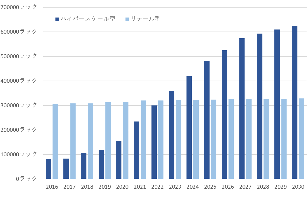 図表1は日本国内の商用データセンターをハイパースケール型・リテール型に分けたうえで、新設・増床時のラック数を年次で集計したものです。