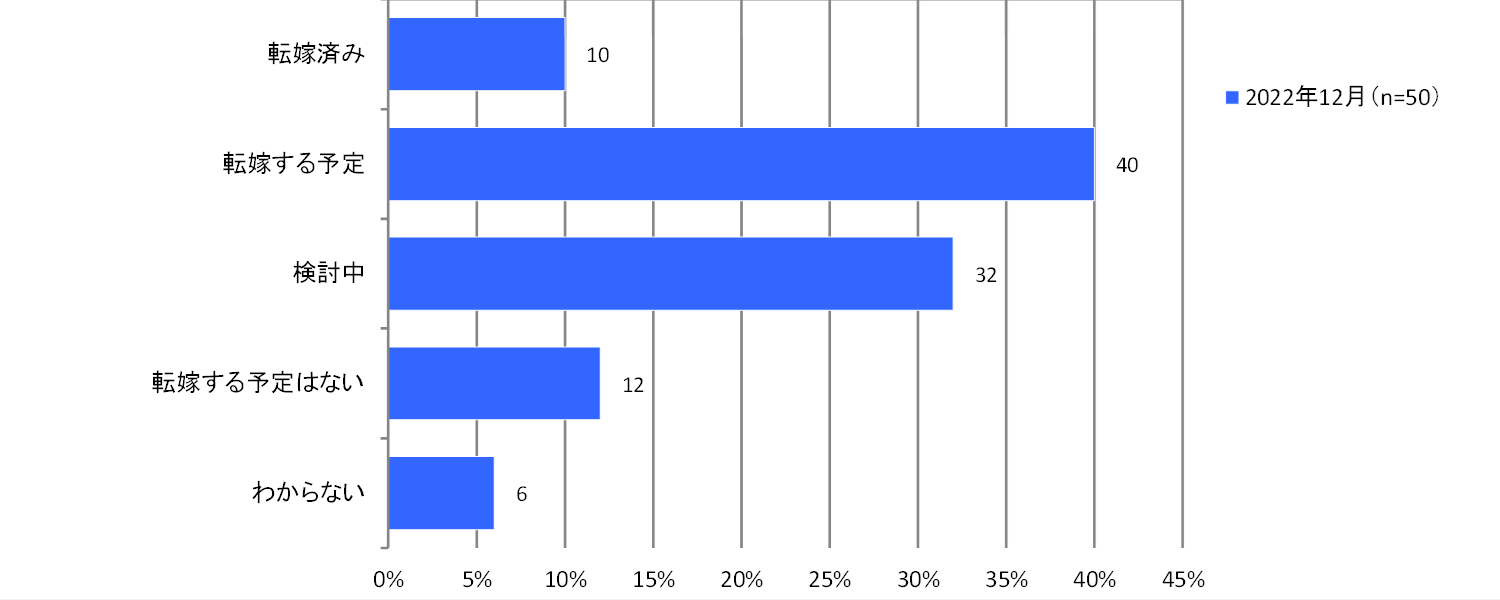 データセンター事業者に電力料金上昇分をデータセンターの利用料金に転嫁する意向を尋ねたところ、「転嫁する予定」は40%で、「転嫁済み」の事業者も10%となっています。すでに半数の事業者が転嫁済みまたは転嫁予定です。さらに、「検討中」が32%で高く、多くの事業者が転嫁する傾向です。事業者の従業員規模別による傾向の違いは見られず、どの規模の事業者も転嫁するのがデータセンター業界の流れになる見込みです。