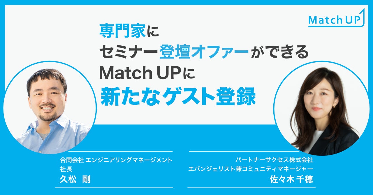 当社は、国内最大級のオンライン展示会「ITトレンド」や、ビジネス動画プラットフォーム「チラヨミ」を通して、多くの企業様、専門家の方とのお取引があり、自社のマーケティングノウハウを活かし、このような課題を解消するため、専門家にセミナー登壇オファーができるマッチングプラットフォーム「Match Up」の提供を開始いたしました。