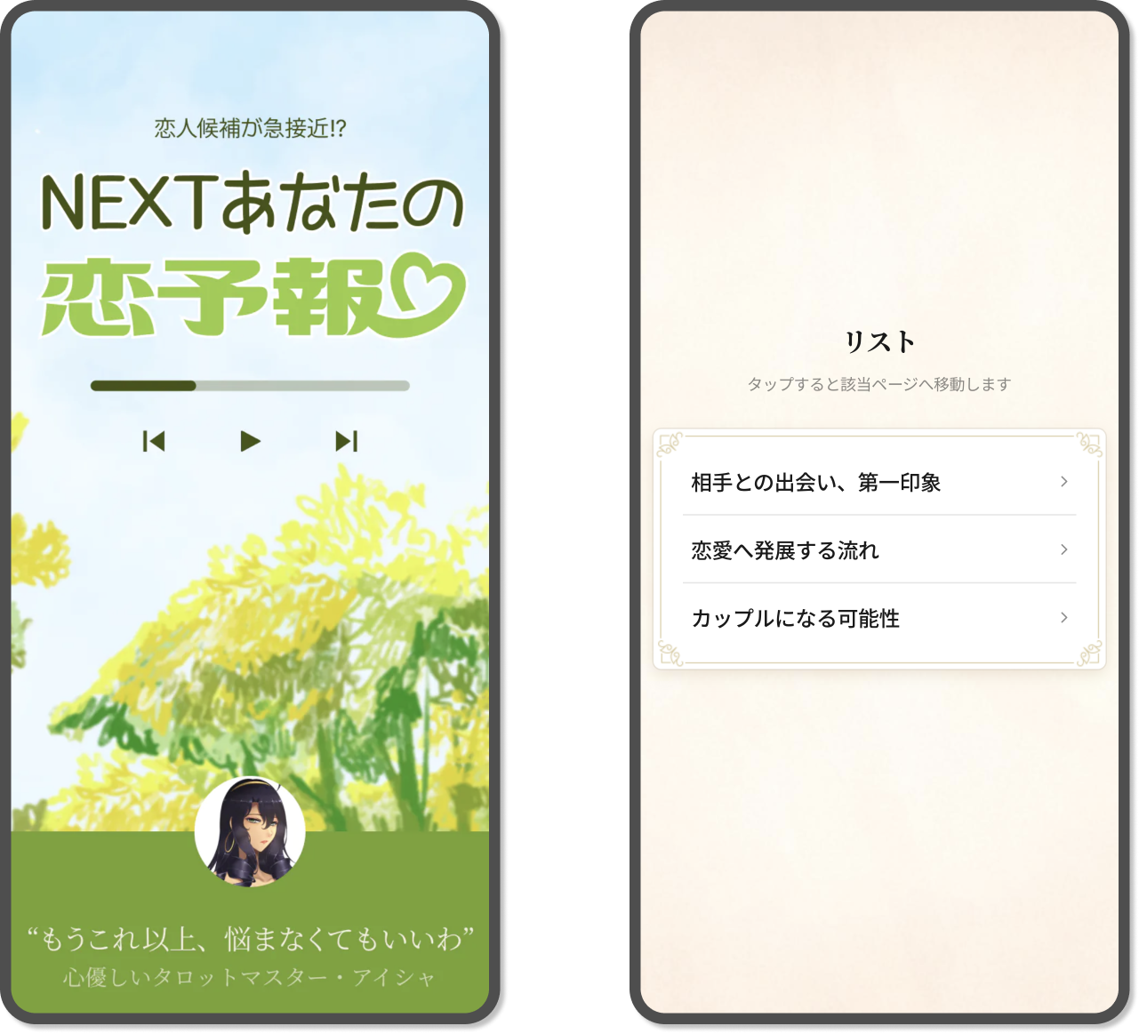 今回リリースされた「恋人候補が急接近!? NEXTあなたの恋予報♡」では、タロットカードを用いて、今後どのような恋が訪れるのかを占うことができます。