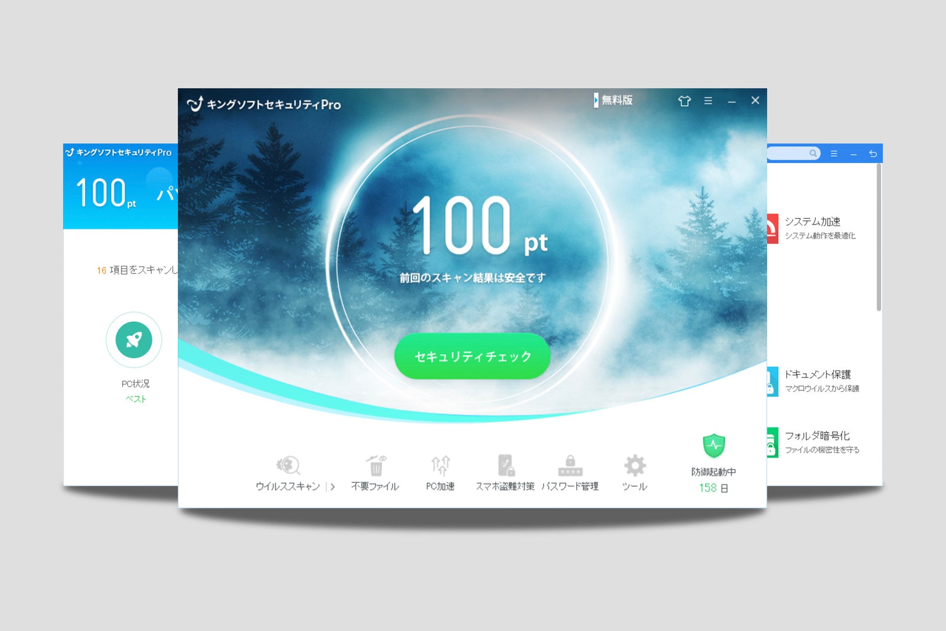 「キングソフトセキュリティPro」は、ウイルススキャンやセキュリティチェックといった機能の他、フィッシングサイト対策機能、ランサムウェア保護機能など、パソコンを安心・安全に利用するための機能を搭載したセキュリティソフトです。シンプルな操作画面で直感的に使えるデザインと、高速のスキャンスピード、従来のセキュリティソフトにありがちなパソコンへの高負荷を減らした軽さと快適さを実現できます。