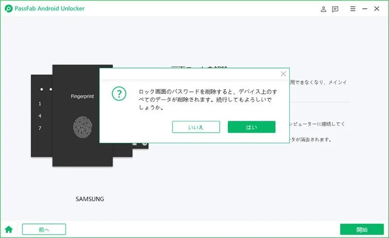Step4:「ロック画面のパスワードを削除すると、デバイス上のすべてのデータが削除されます。続行してもよろしいでしょうか。」と注意事項が表示されるので、確認して「はい」をクリックします。