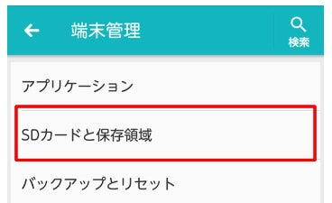 Step2:「SDカードと保存領域」を選んで「キャッシュデータ」をタップします。