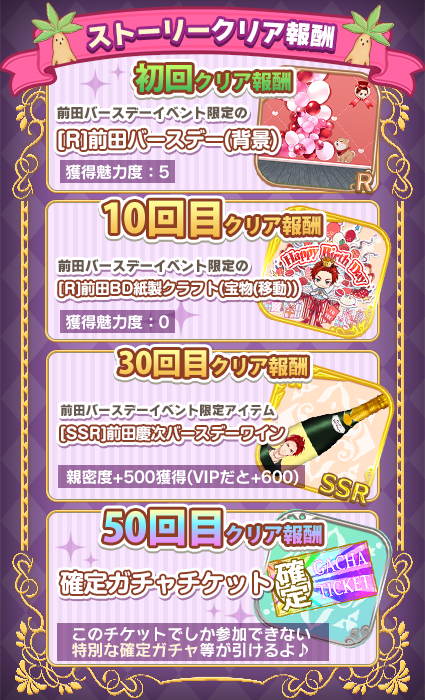 クリア回数に応じて豪華プレセント♡1回目クリアの報酬は、このシナリオ限定「前田バースデー」背景アバターがゲットできちゃう☆