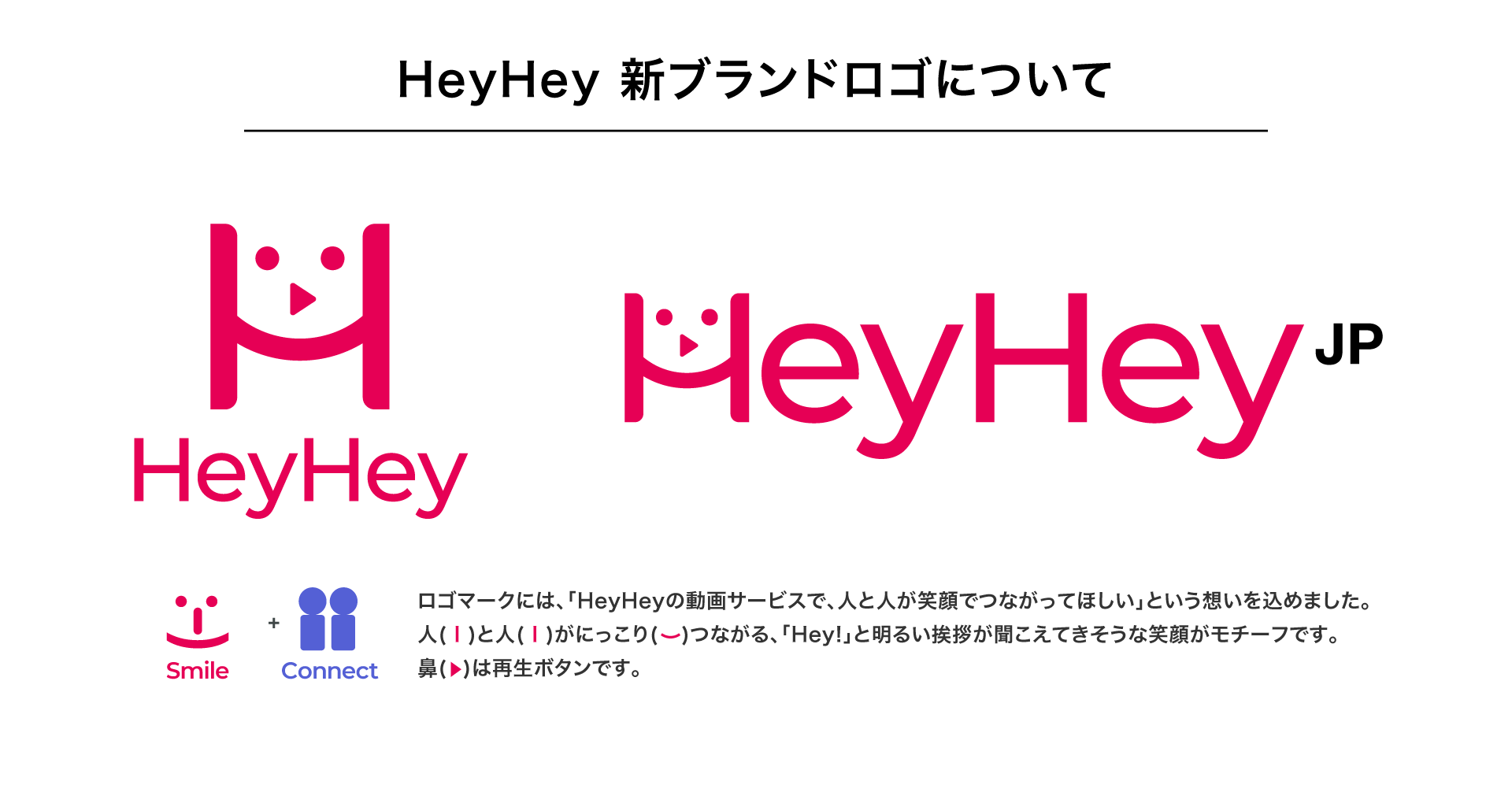 ロゴマークには、「HeyHeyの動画サービスで、人と人が笑顔でつながってほしい」という想いを込めました。人( I )と人( I )がにっこりつながる、”Hey!”と明るい挨拶が聞こえてきそうな笑顔がモチーフです。鼻(▶)は再生ボタンです。