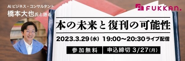 株式会社復刊ドットコム(代表取締役社長:岩本利明。以下、復刊ドットコム)は、2023年3月29日「AIビジネス・コンサルタント橋本大也氏と語る 本の未来と復刊の可能性」と題したオンライントークイベントを無料で開催します。