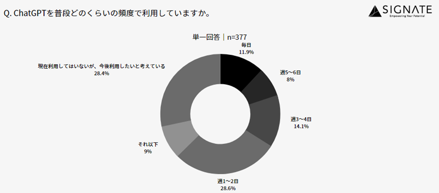 1. 普段からChatGPTを利用している方は、71.6%。また、現在利用していないと回答した28.4%も、今後利用したいと回答。 |