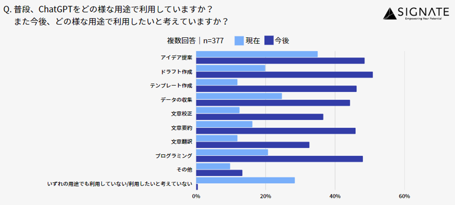 ・普段から35.0%が「アイデア提案」、24.7%が「データの収集」の用途で利用していると回答。半数以上の人が、今後「ドラフト作成」で利用したいと回答。