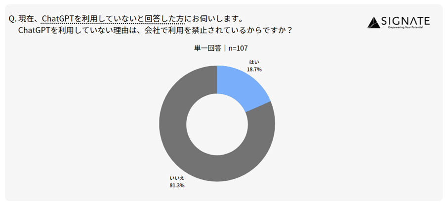 ・ChatGPTを利用していないと回答したうち、約2割の方が会社からChatGPTの利用が禁止されているためと回答。