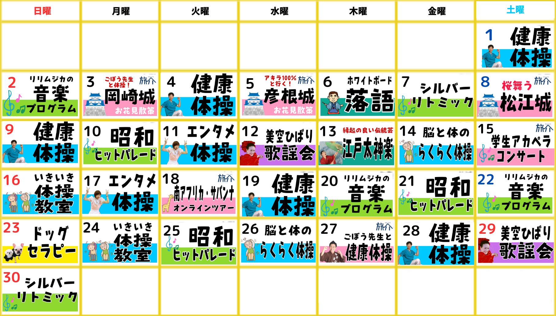 介護施設でのオンラインでレクリエーション開催実績豊富な人気講師が、日替わりで開催します。