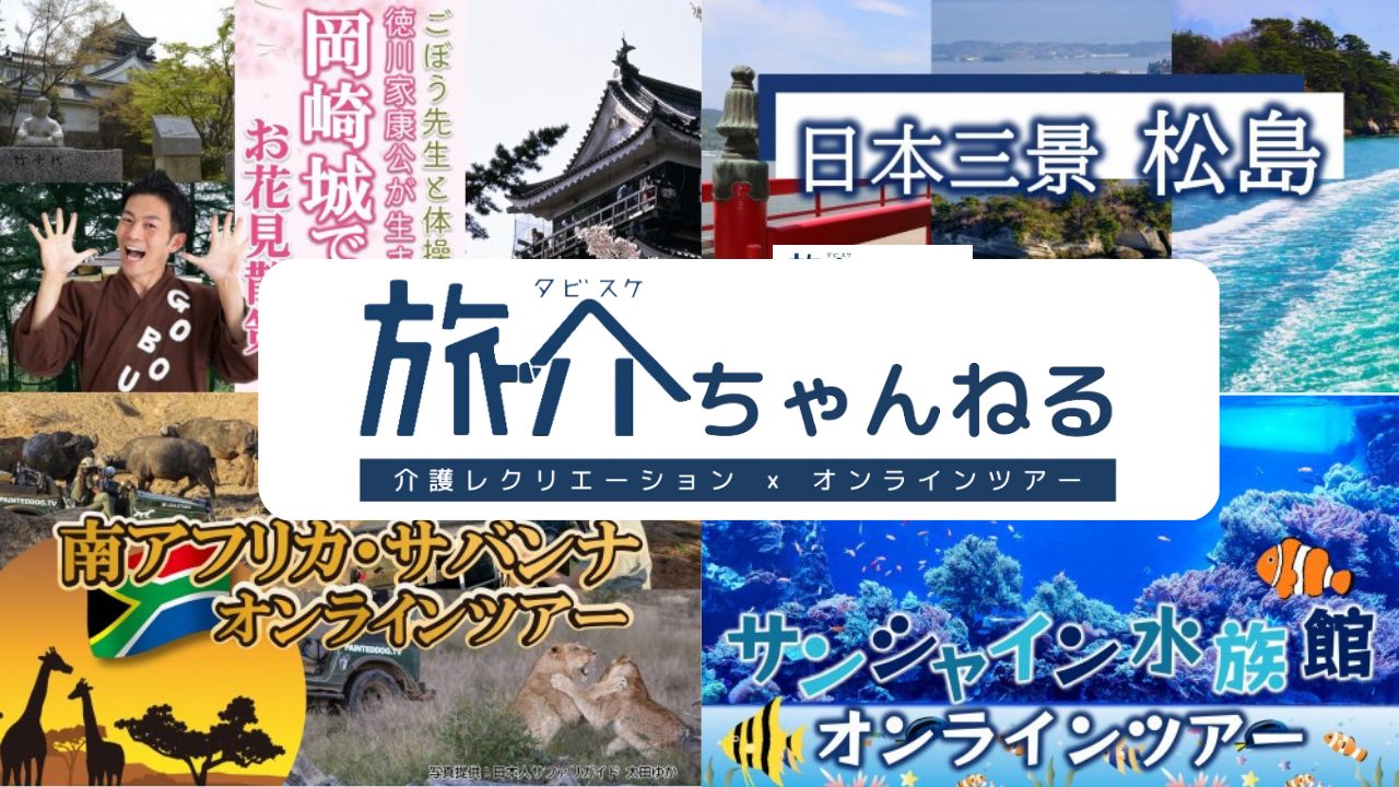 旅介ちゃんねるでは、すべての人が気軽に旅行を楽しんでいただくための1つの手段としてオンライン配信を行なっています。映像ではありますが、行きたくても行けない介護施設ご利用の皆様を全国各地にお連れします。