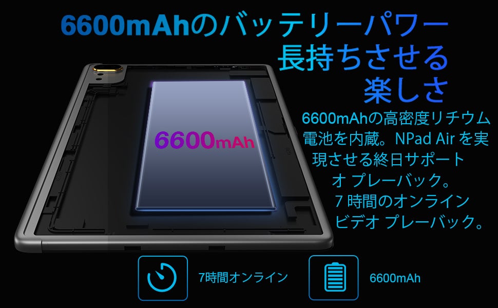 【大容量ストレージ+長寿命】4GBのRAM(メモリー)と64GBのROM(高速ストレージ)を搭載し、MicroSDカードによる拡張ストレージに対応。タブレットの大容量ストレージにより、Webサイトやビデオをスムーズに視聴し、頑丈なアプリや高品質のゲームを楽しむことができます。また、最大6600mAhの大容量バッテリーで最大6時間の連続再生が可能です。NPad Airは、最大1TBの容量のTFカードもサポートし、より多くのニーズを満たすためにストレージスペースを拡張します。