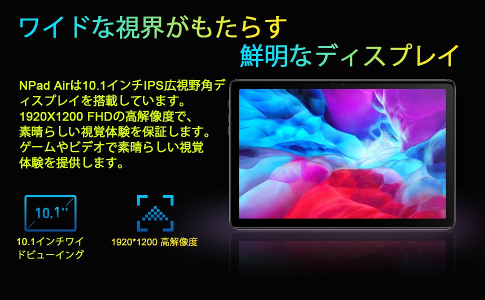 【高性能CPU+10インチ FHD】NPad Airの UNISOC T310は、TSMCの12nmプロセスで製造され、DynamIQアーキテクチャを使用して、パフォーマンスと消費電力を考慮したチップフレームワークを実現し、3つの高効率「A55」コアと複数のCPUコアが連携して動作します。また、学習、エンターテインメント、仕事の効率を大幅に向上させる超省電力機能を備えています。Antutuのランニングスコアは16w点と高く、9863aに比べて性能向上率が高い.10.1インチの1920×1200の解像度を搭載し、ディスプレイはより繊細で滑らかで、視覚効果が優れています