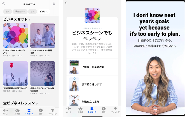 「ミニコース」では、スピーキングにおける強弱の付け方によって変わるニュアンスや、会議の際に多用される表現、各種文法のシーン別利用方法などを英語で学べるほか、全てのミニコースにおいてスピーキングを行うことで、リスニング、スピーキングを通して英語表現に必要な各種スキルを学ぶことが出来ます。