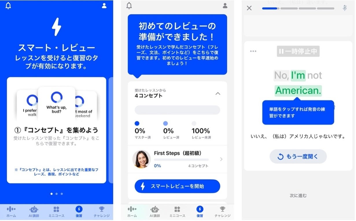 また、各コースの学習コンテンツに加え、レッスンの復習に欠かせない「ドリル」や「レッスンサマリ」も用意されており、学んだ内容を強化・定着させることで、利用者のスピーキングスキルを全体的に上達させることが可能となります。