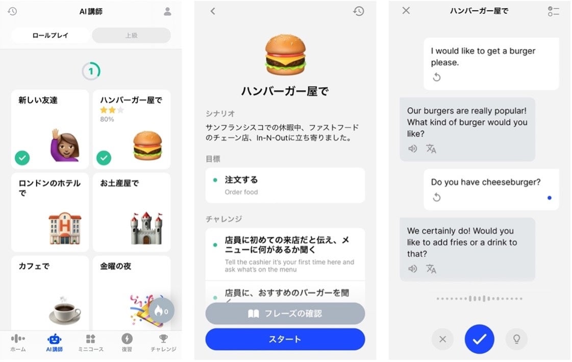 「シーン」や「シチュエーション」に即したスピーキングを行うロールプレイ型「AI講師」