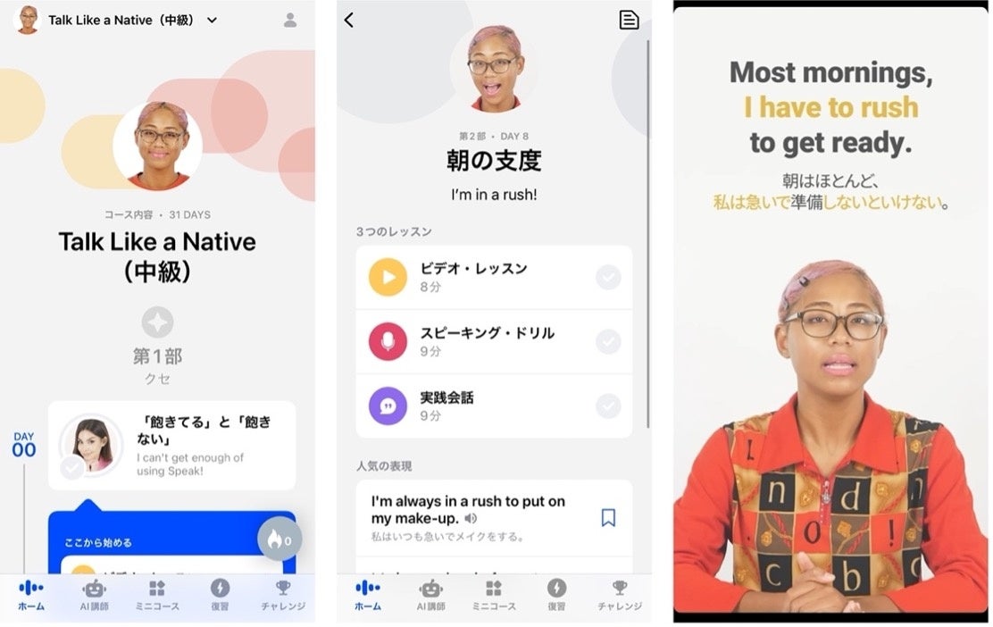「スピーク」は、英語学習者のレベルに合わせてスピーキングレベルの向上を図る「レベル別コース」、ホテルのチェックイン、レストランでの注文など海外旅行、日常生活、ビジネスシーンにおいて想定される各種シチュエーションに応じてAIとの会話が出来る「AI講師」、英語特有の表現や英文法、発音時の強弱の付け方が学べる「ミニコース」の3つのコンテンツで構成されており、全てにおいて言語習得及び、スピーキングスキル向上に不可欠な「聞く」と「話す」を繰り返し行う音声中心の学習となります。