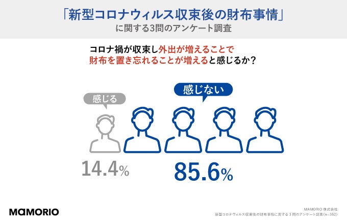 今回の調査の結果、「今後コロナ禍が収束し外出が増えることで財布の置き忘れは増減するか」との問いには「感じない」との回答が85.6 %にものぼり、今後コロナ禍以前の外出頻度に戻っても財布の置き忘れ/紛失リスクの増加を懸念している方はごく僅かであることが浮き彫りとなりました。