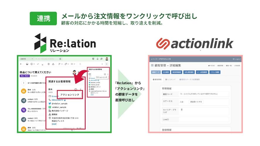 『Re:lation』に届いた顧客からのメールやチャット等から『アクションリンク』内の顧客管理画面・受注管理画面を簡単に呼び出すことができるようになりました。
