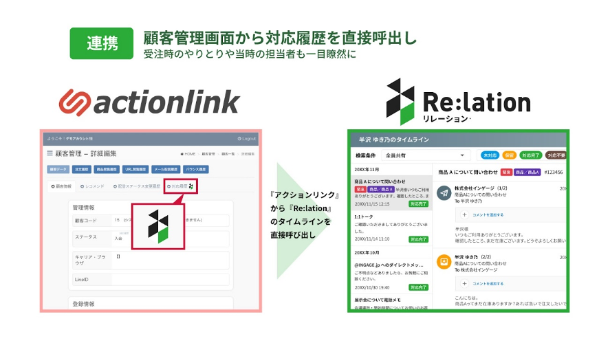 『アクションリンク』内の顧客管理画面上のボタンをクリックすることで、その顧客とのこれまでのやり取りを『Re:lation』のタイムライン機能(顧客との対応履歴)を使ってワンクリックで呼び出すことができるようになりました。