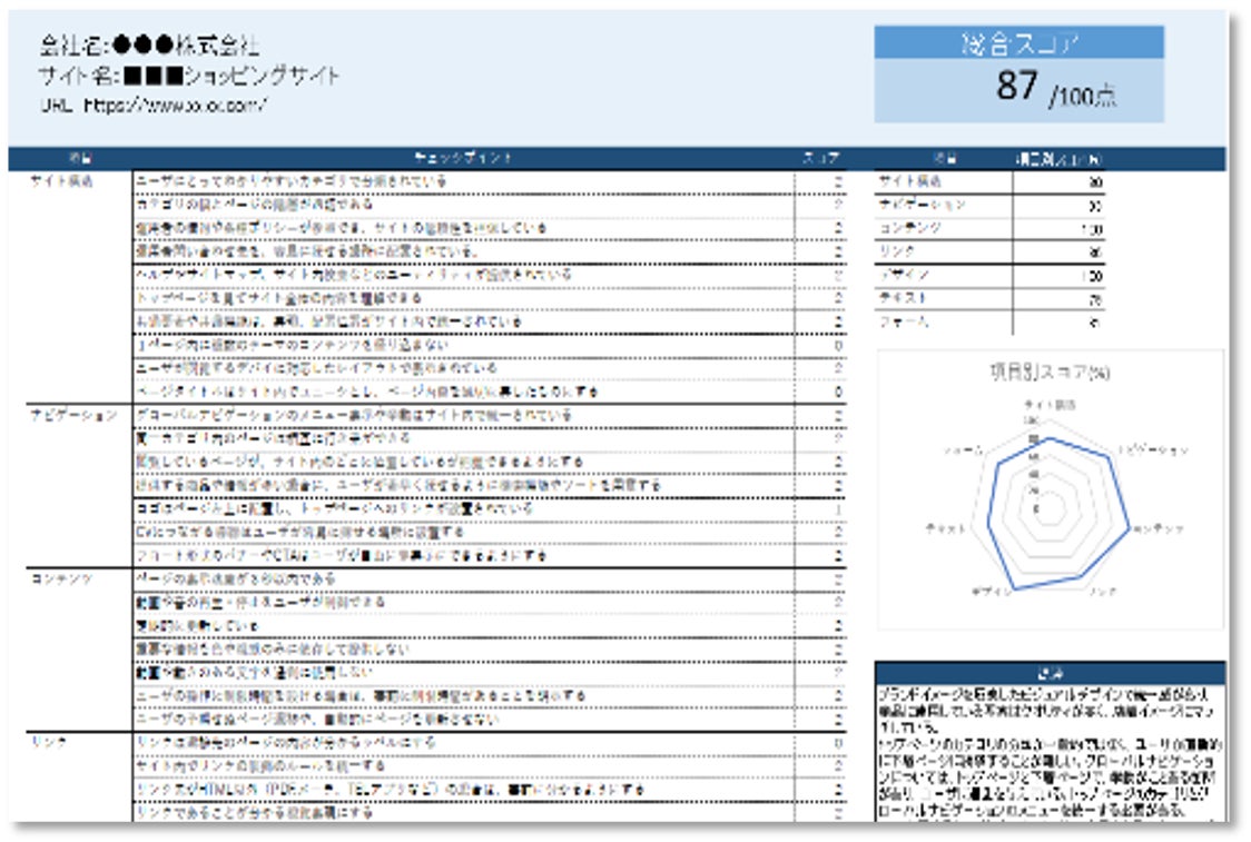 本サービスでは、初めて来訪したユーザーでも使いやすいWebサイトになっているかを「サイト構造」、「ナビゲーション」、「デザイン」等の項目ごとに評価し、Webサイト改善の施策とすることができます。